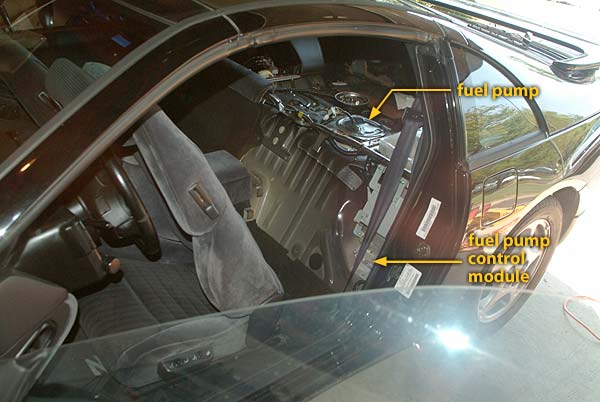 Fuel Pump, 2-seater, view 1 Fuel Pump, 2-seater, view 2 Fuel Pump in mounting assembly, with gasket in background Fuel Pump comparison - 2-seater on left, 2+2 on right Fuel Pump comparison - 2+2 on left in assembly, 2-seater on right Fuel Pump Control Module, view 1 Fuel Pump Control Module, view 2 Fuel Pump Control Module, view 3 Fuel Dampener Fuel Pressure Regulator, views 1 & 2 Fuel Pressure Regulator, views 3 & 4 Pressure Regulator Vacuum Relief (PRVR), located in the driver's side fender Gas tank interior baffles - 2+2